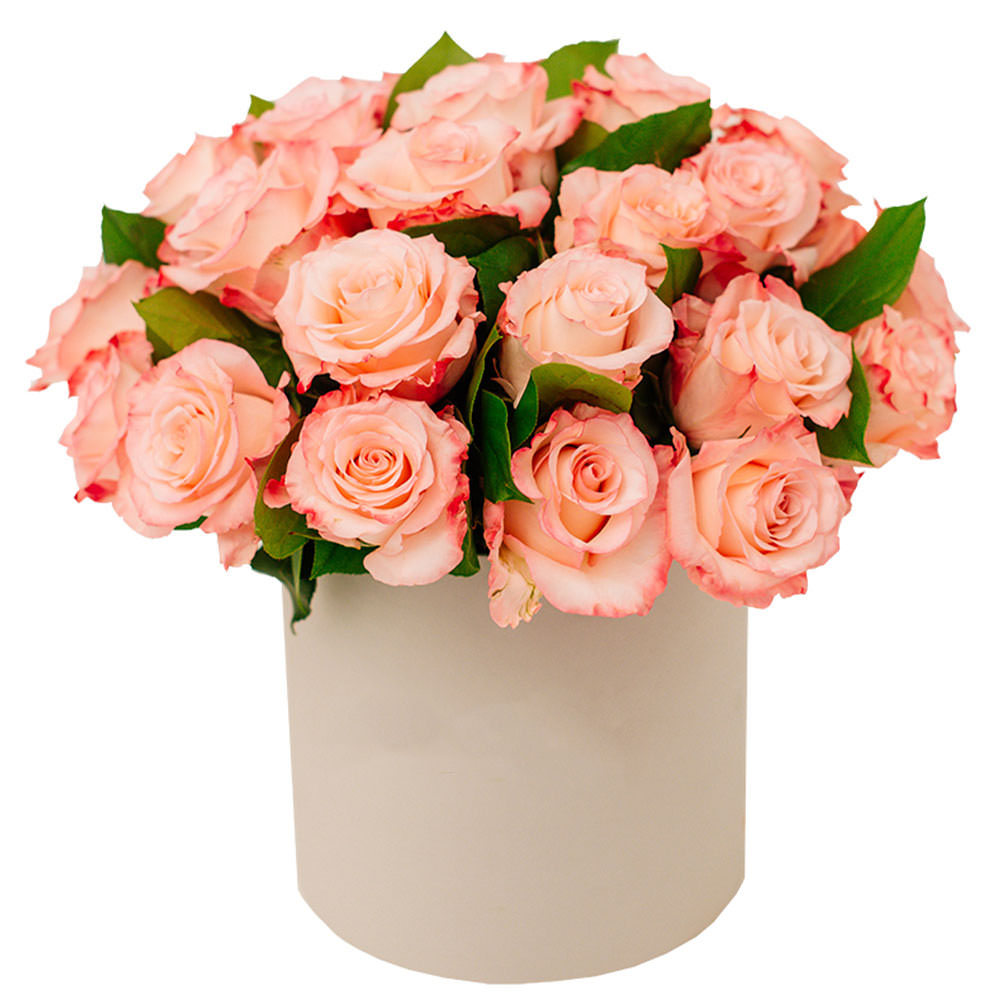 Нежные персиковые оттенки роз создают атмосферу утончённой элегантности. В состав композиции входят одноголовые персиковые розы и зелень. Оформление в шляпной коробке подчёркивает изысканность букета. Эта композиция станет отличным подарком для учительницы на День знаний.