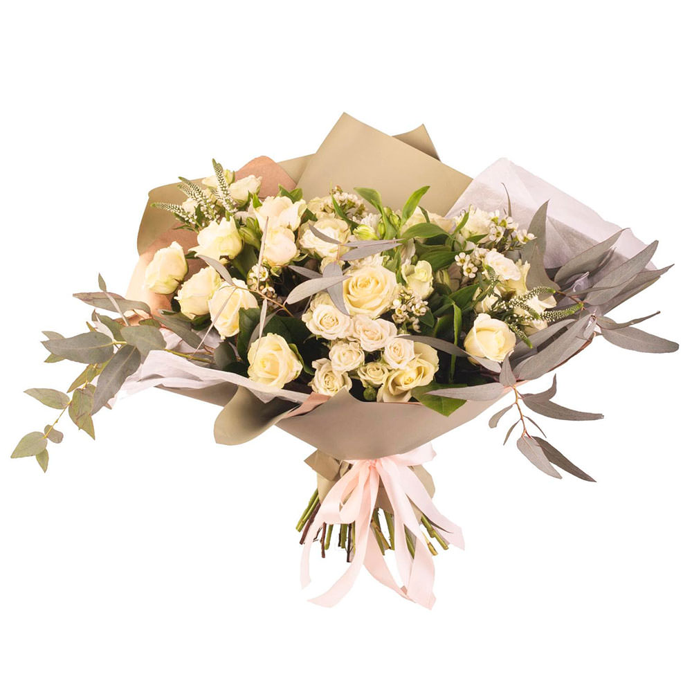 Этот букет удивляет своей нежной кремово-зелёной палитрой. В составе представлены кремовые кустовые розы, вероника, ваксфлауэр и эвкалипт. Упакован в матовую пленку и перевязан нежной атласной лентой. Композиция создаёт атмосферу легкости и утончённости. Идеально подойдёт для поздравления любимой на День святого Валентина.