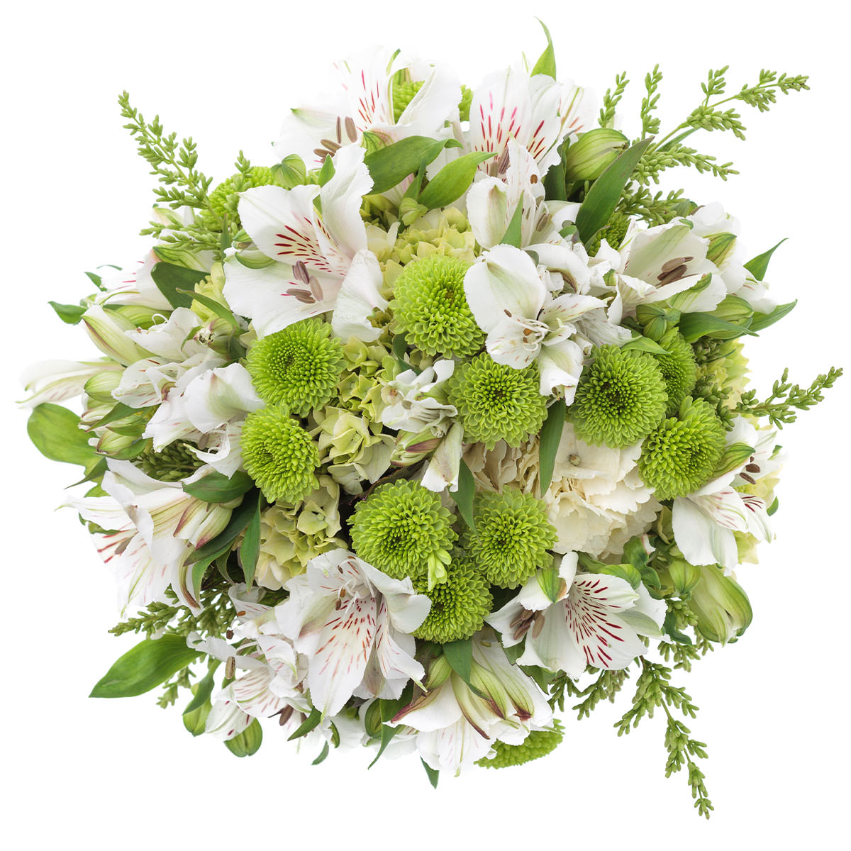 Альстромерия белая, гортензия зеленая, хризантема зеленая, зелень. Упаковка (лента, пленка, крафт, сетка, пленка матовая)