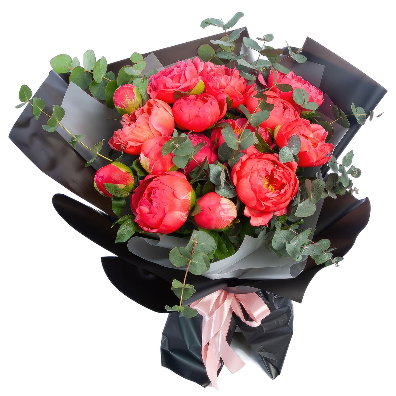 Яркие коралловые пионы и свежий эвкалипт создают впечатление летнего заката. Букет оформлен в стильную комбинацию черной матовой пленки и нежно-розовой атласной ленты. Такая композиция привносит в атмосферу нотки свежести и элегантности. Прекрасный подарок для сестры на выпускной вечер.