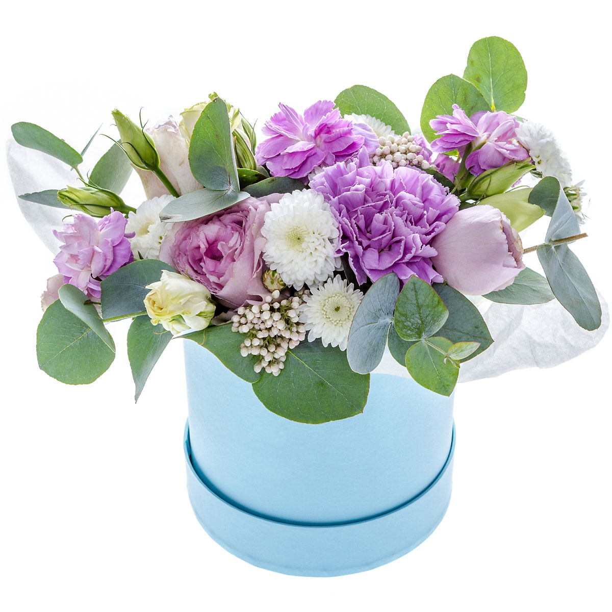 Этот букет погружает в нежные сиреневые и белые тона. В его составе сиреневая гвоздика, белая кустовая хризантема, пионовидная роза сиреневого оттенка, кремовая кустовая роза, сиреневая маттиола, озотамнус и эвкалипт. Композиция оформлена в шляпной коробке голубого цвета, которая добавляет свежести и изысканности. Идеально подходит для создания романтической атмосферы. Преподнесите этот букет любимой женщине на годовщину.