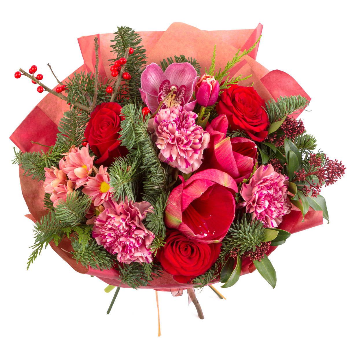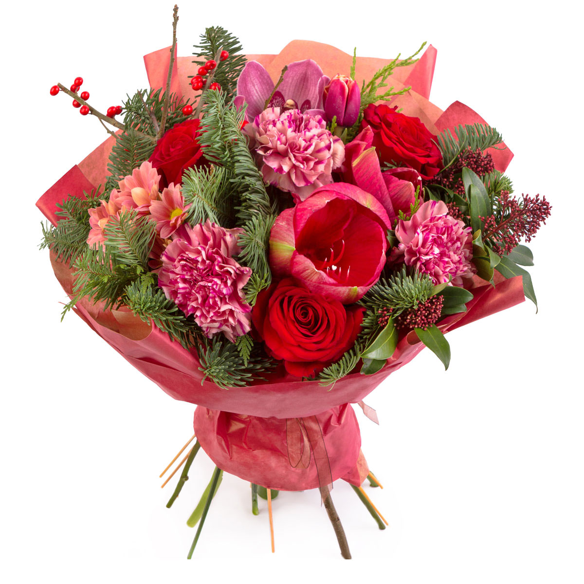 Этот букет впечатляет своей насыщенной красно-розовой палитрой. В его составе красные розы, амариллис, розовая орхидея, розовые кустовые хризантемы, пион и веточки илекса и пихты. Упакован в красную матовую пленку и перевязан лентой, создавая праздничное настроение. Идеальный подарок на юбилей для свекрови.