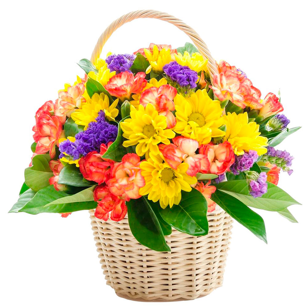 Эта яркая композиция удивляет гармонией жёлтых хризантем, оранжевых кустовых гвоздик и фиолетового лимониума. Все цветы собраны в плетёную корзину, которая подчёркивает их естественную красоту. Композиция создаёт атмосферу радости и уюта. Идеально подходит для подарка сестре на День знаний.