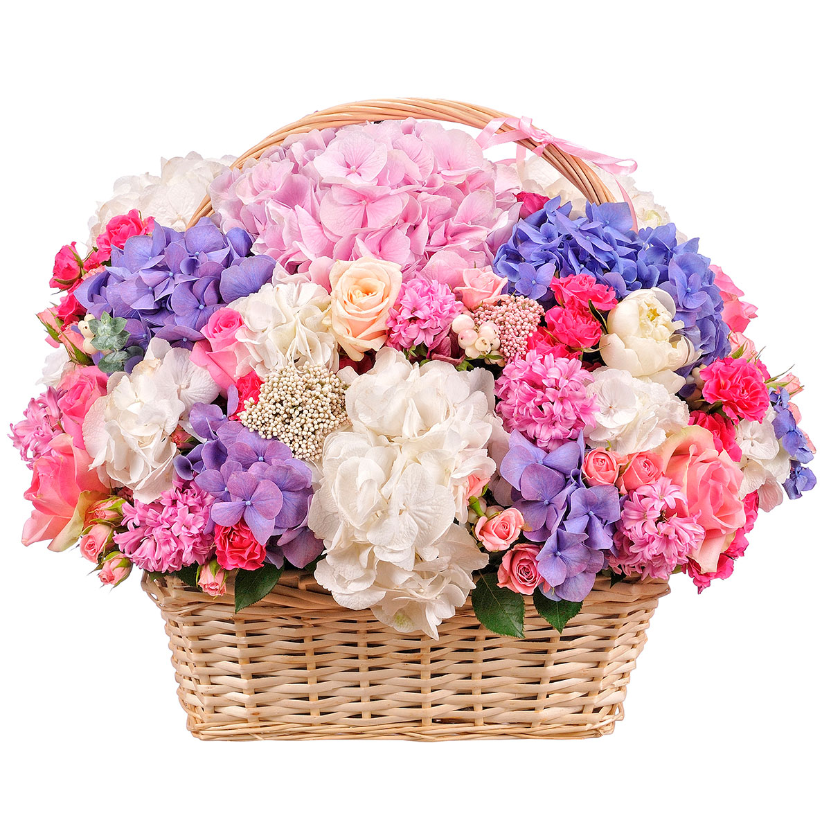 Эта яркая композиция в розовых, белых и фиолетовых тонах дарит ощущение радости и нежности. В составе гортензия микс, роза кустовая и одноголовая розовая, пион белый, гиацинт розовый и озотамнус. Плетёная корзина с ручкой подчёркивает естественность и изящество цветов. Создаёт атмосферу весеннего праздника, идеально для встречи из поездки. Станет прекрасным подарком для молодой мамы.