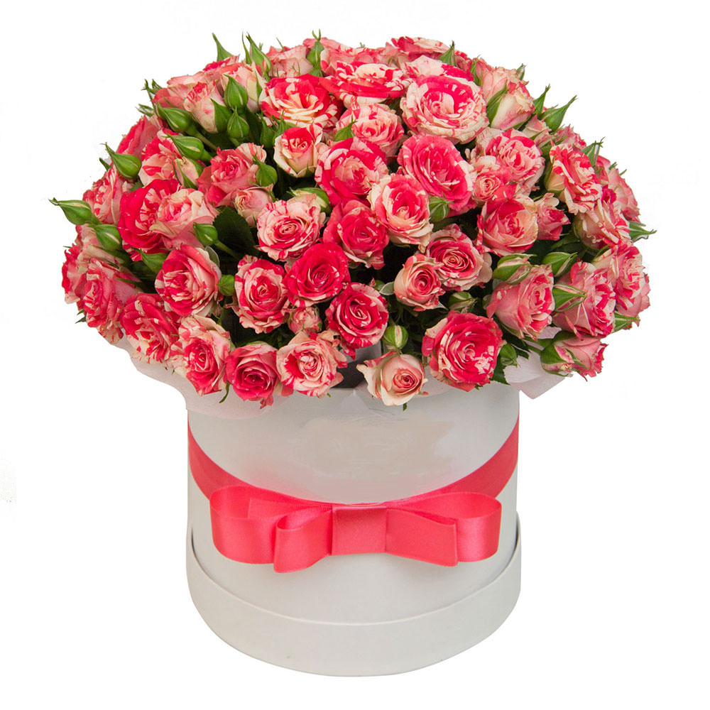 Очаровательная розово-белая гамма кустовых роз Эквадор создаёт атмосферу нежности и радости. Цветы аккуратно размещены в стильной шляпной коробке белого цвета, украшенной яркой розовой лентой, завязанной в бант. Такая композиция станет прекрасным подарком на День Святого Валентина для любимой. Подойдет для создания романтической атмосферы на ужине.