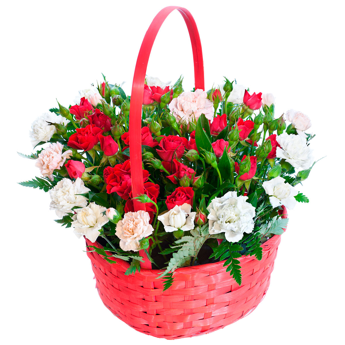 Эта композиция дарит ощущение радости и тепла благодаря ярким красным кустовым розам и нежным белым мини-гвоздикам. Цветы размещены в плетёной корзине с красной ручкой, создавая эффектный контраст и праздничное настроение. Композиция станет прекрасным украшением на День матери для любимой женщины. Идеально подходит для создания уютной атмосферы в доме или офисе.