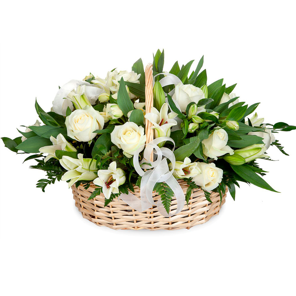 Эта нежная композиция в белых тонах восхищает своей элегантностью. В составе белые одноголовые розы, изящные белые лилии и нежный папоротник. Корзина плетена из светлого материала и украшена легкой белой лентой. Композиция создаёт атмосферу утончённости и подходит для романтического вечера для любимой женщины.