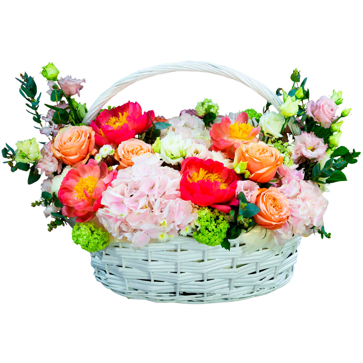 Изысканная палитра розовых, коралловых и персиковых оттенков создаёт атмосферу нежности и гармонии. Композиция включает розовую гортензию, коралловые пионы, персиковые одноголовые розы, розовую эустому, вибурнум, белую мини-маргаритку и эвкалипт. Цветы расположены в белой плетёной корзине, что придаёт ей особую элегантность. Это идеальный подарок для сестры на юбилей, который обязательно создаст праздничное настроение.