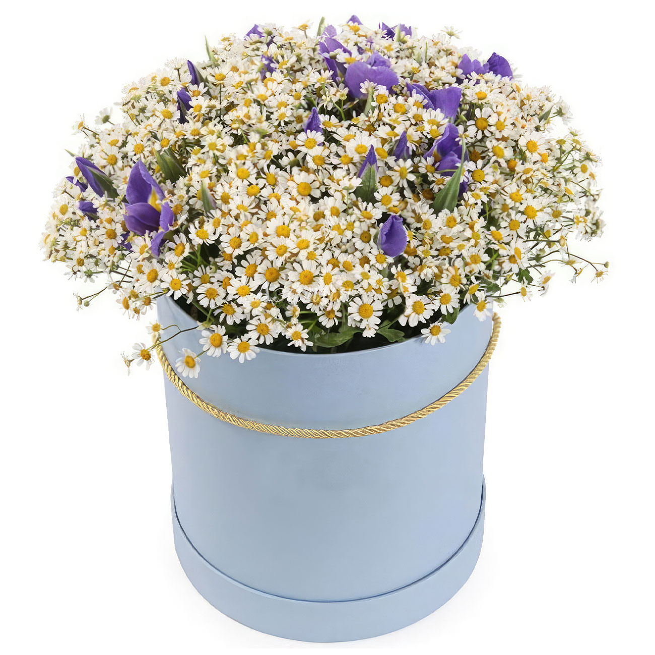 Эта композиция погружает в атмосферу нежности и свежести благодаря сочетанию белых ромашек и фиолетовых ирисов. Цветы аккуратно размещены в светло-голубой шляпной коробке, украшенной золотистой веревкой. Она создаёт лёгкую и романтичную атмосферу, идеально подходящую для свидания. Прекрасный подарок для любимой женщины.