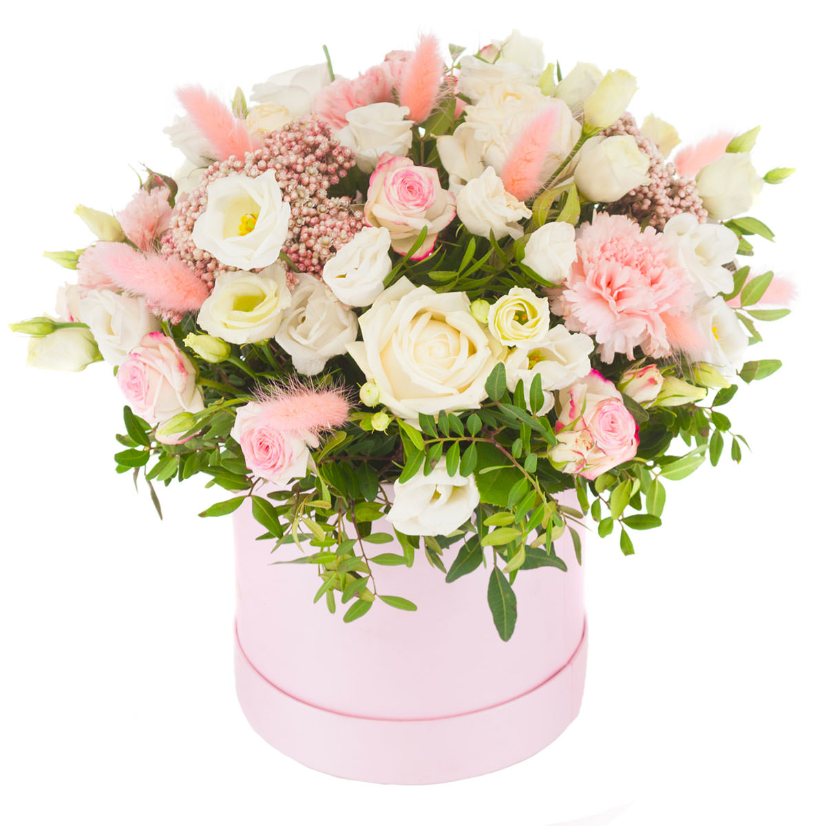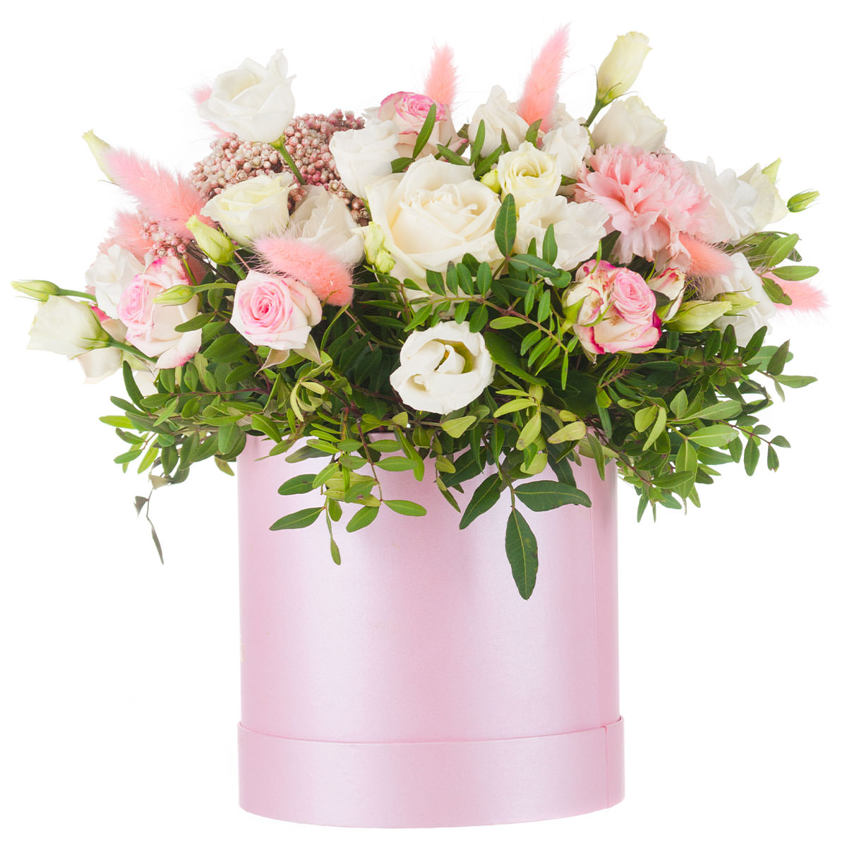 Эта композиция завораживает своей мягкой цветовой палитрой, состоящей из белых одноголовых роз, розовых кустовых роз, белых эустом и розовых гвоздик. Каждое цветочное сочетание аккуратно уложено в розовую шляпную коробку, создавая элегантный вид. Такая композиция будет идеальной для романтического вечера или на День Святого Валентина, чтобы порадовать любимую женщину.
