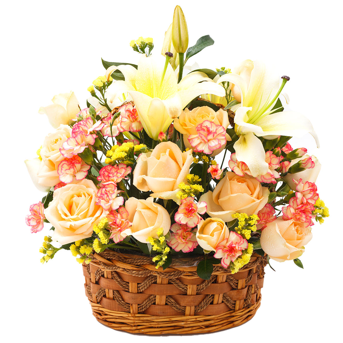 Эта изысканная композиция сочетает в себе кремовые розы, белоснежные лилии, розовые мини-гвоздики и солнечную желтую статицу. Цветы расположены в плетёной корзине, создающей уютный и натуральный образ. Композиция наполняет атмосферу лёгкостью и радостью, идеально подходя для юбилея. Порадует для любимой женщины на годовщину.