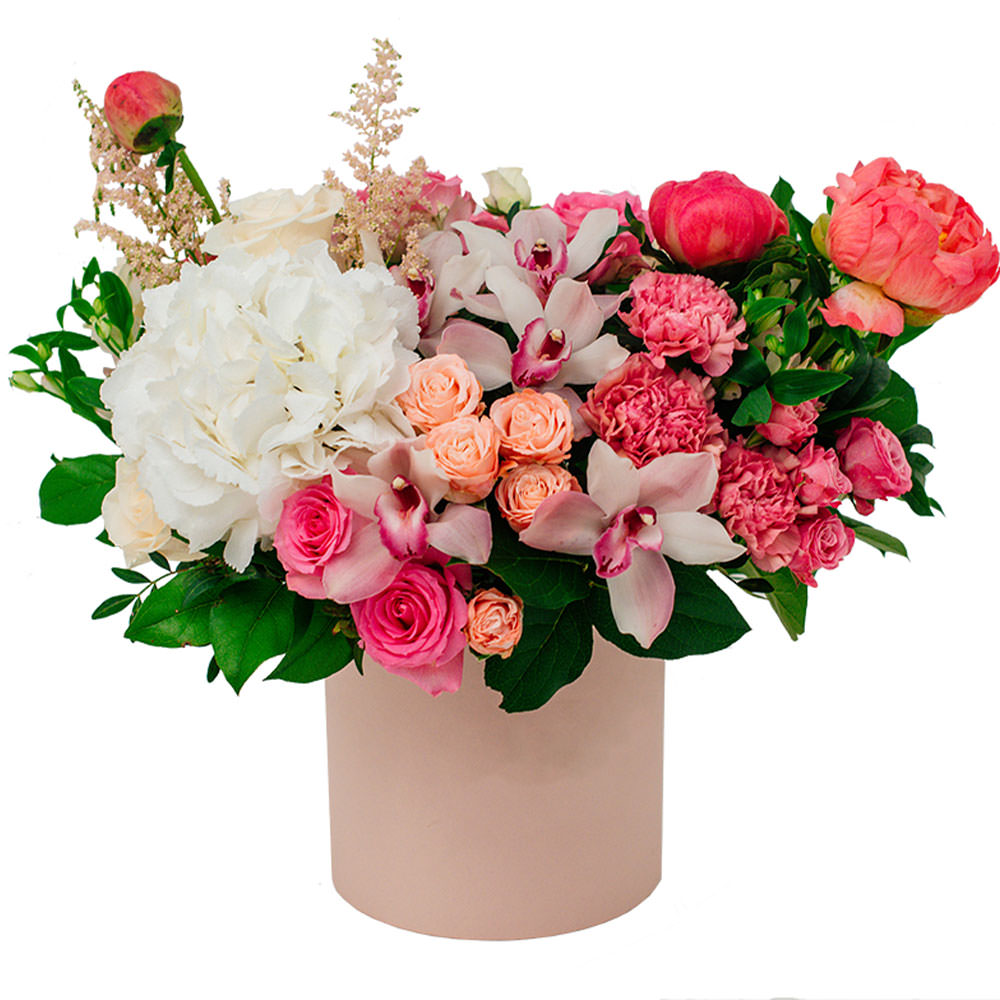 Пастельная палитра розовых и кремовых оттенков создаёт нежное и романтичное настроение. В составе букета — белая гортензия, кустовая роза, розовая одноголовая роза, розовая гвоздика, коралловый пион, розовая орхидея и эулалия. Композиция представлена в стильной шляпной коробке нежно-розового цвета. Идеально подходит для встречи из поездки, чтобы подарить радость и тепло вашей любимой женщине.